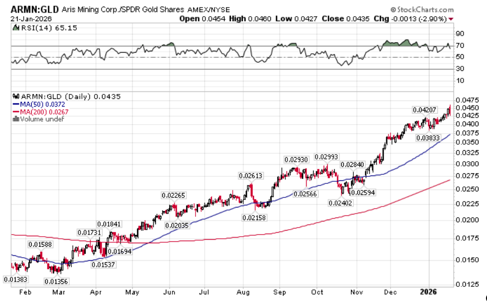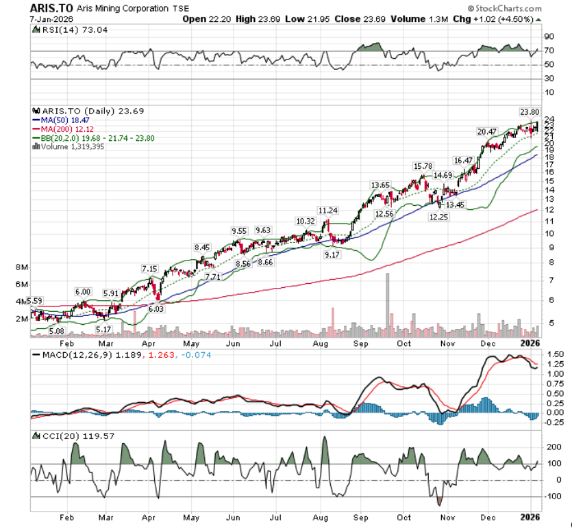 "Die Zeitung „The Globe and Mail” berichtet in ihrer Mittwochsausgabe, dass acht der zehn Unternehmen mit der besten Performance im S&P/TSX Composite Index im Jahr 2025 Goldproduzenten waren und ihre Gewinne den Index im Jahresverlauf um 27 Prozent nach oben getrieben haben. Tim Kiladze von Globe schreibt jedoch, dass die größten Gewinner möglicherweise die Führungskräfte von Edelmetallunternehmen sind. Nicht nur, dass ihre aktienbasierte Vergütung mit dem Anstieg der Gold- und Silberpreise an Wert gewonnen hat, viele von ihnen verfügen auch über Aktienoptionen, die zu Beginn des Jahres noch wertlos waren und nun wie Goldgruben aussehen. So legten beispielsweise die Aktien von Aris Mining im Jahr 2025 um 328 Prozent zu. Aris wurde mit Startkapital von Neil Woodyer und Frank Giustra gegründet und wird von Ian Telfer, ehemals Goldcorp, geleitet. Im Jahr 2024 entwickelte sich Aris von einem kleinen Bergbauunternehmen zu einem etablierten Akteur. Im September wurde das Unternehmen in den S&P/TSX Composite Index aufgenommen. (Es wird auch in New York gehandelt.) Der 81-jährige Woodyer, der in Monaco lebt, hielt zum 31. März Aktien und aufgeschobene Aktien im Wert von 19 Millionen Dollar, wie das Unternehmen in einer Meldung an die Aufsichtsbehörde bekannt gab (alle Zahlen in US-Dollar). Zu diesem Zeitpunkt wurde die Aris-Aktie für 4,64 Dollar gehandelt. Ende Dezember lag der Kurs der Aris-Aktie bei 15,65 Dollar, was bedeutet, dass allein die Aktienbestände von Herrn Woodyer einen Wert von 65 Millionen Dollar hatten."