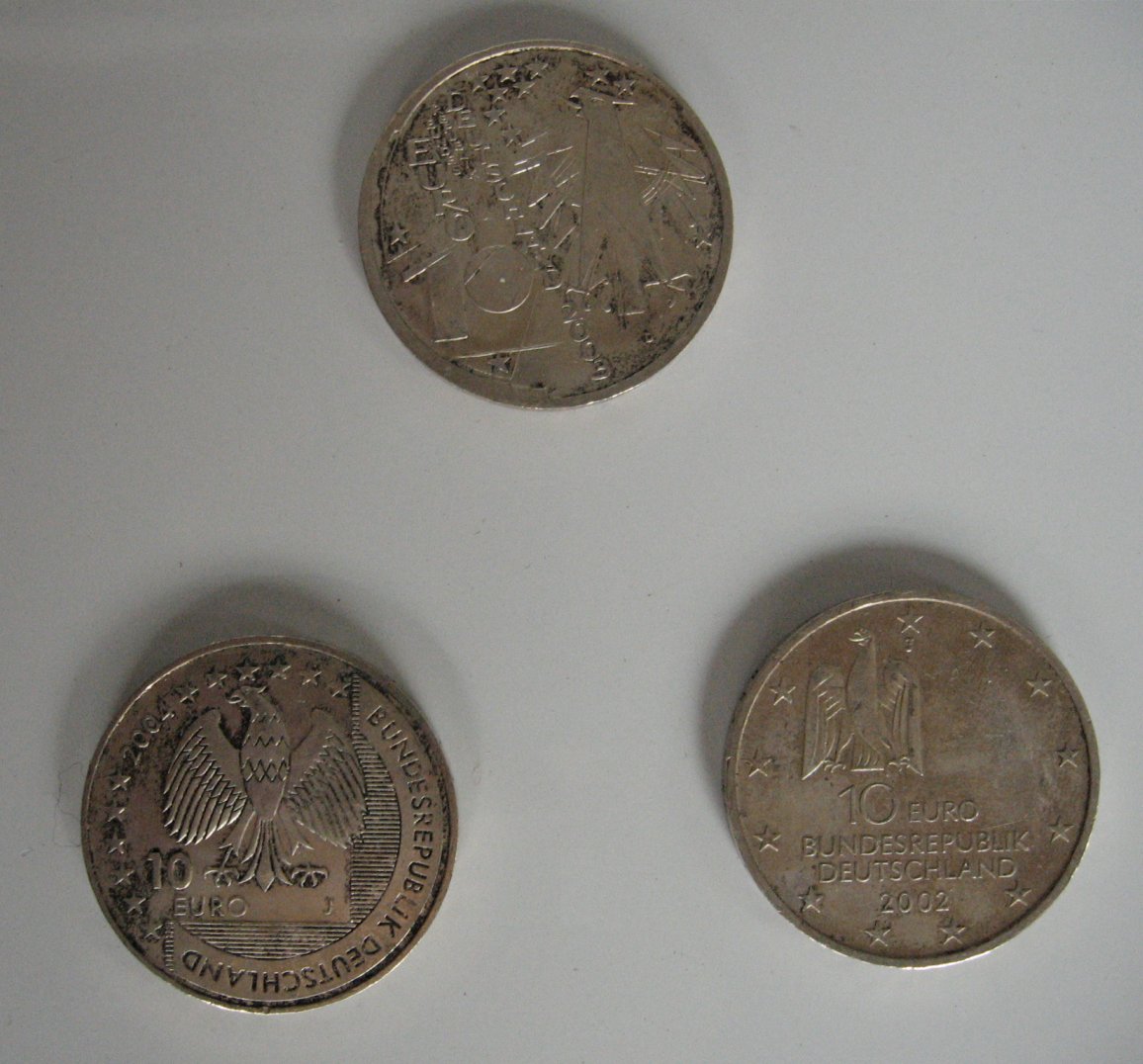 Die Sache fand ich so faszinierend, dass ich das auch gleich an drei uralten Silber-Zehnern ausprobieren musste. Dabei handelte es sich um völlig verkrustete und verdreckte Exemplare (u.a. ein Zehner "Deutsches Museum"), die völlig hoffnungslos aussahen (siehe nächstes Posting).
