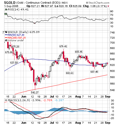 On Friday, gold closed at 625.09 and just under the 50-dma. Note the similarity with the copper chart in that we are making lower highs and higher lows, the last of which was on August 29th. I now believe we are done to the downside and will begin a move up that will take us into February or March of 2007 and, at the very least, reach good resistance at 775.00 and could have the potential to go much higher.