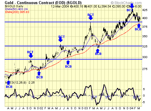 As gold stock traders, our signals come from the $HUI, however, understanding the movement of the price of gold (POG), and being familiar with its charts, will help to ease the fear and provide confidence at times when the market sentiment is overwhelmingly bearish. It ain’t hard to understand the constant fear we gold traders often find ourselves in, after all, its been a 20 year bear market for gold, and I bet if tech stocks just came out of a 20 year bear market, you’ll feel the same way.