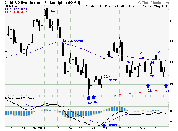 Notice $XAU is still on the BSBS from early Feb, and MACD has not crossed down for a sell signal like the $HUI has.