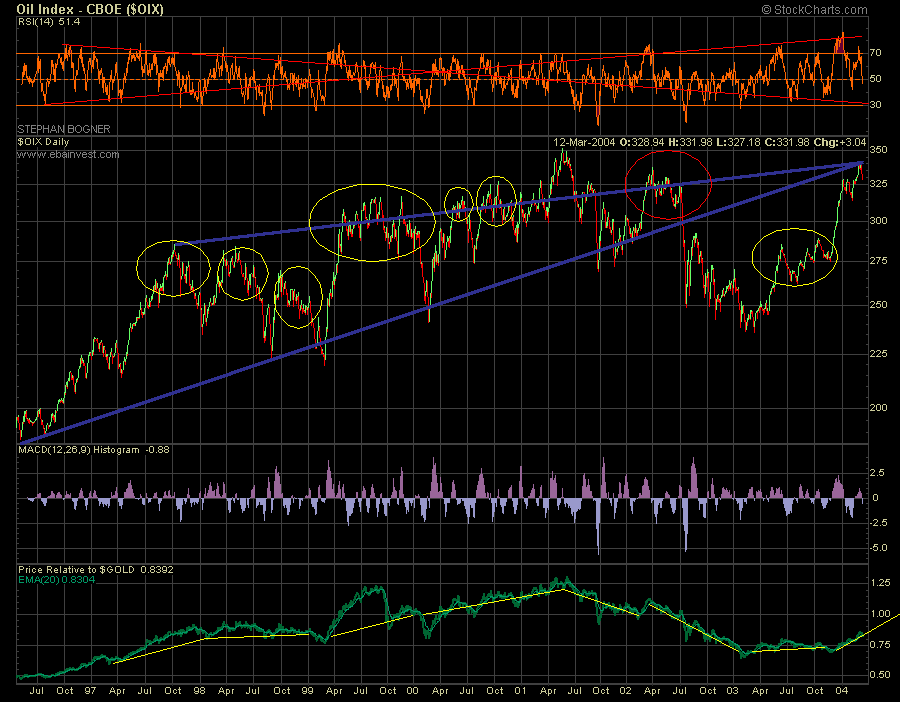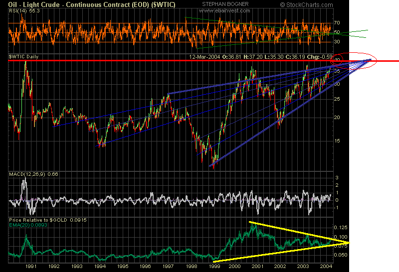 In dem Ölchart hier unten ist unten der Ölpreis relativ zum Goldpreis mit dabei. ZUFÄLLIG befindet die beiden sich ebenfalls in einem 3eck zueinander!!!!