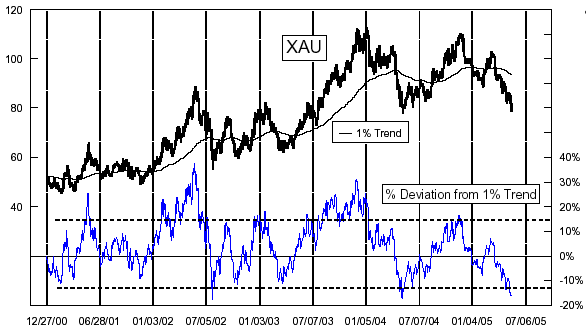 Gold dropped for the third trading day in a row, and has now fallen $8.60/oz since last Wednesday. The XAU is in even worse shape, as gold stock traders seem to be abandoning all hope. That index is nearing the level of its May 2004 low. But more important than the level is the fact that the XAU has fallen really far in a short time. That adds up to an oversold condition, as illustrated by the indicator in our chart. Over the past 4 years, only the July 2002 and May 2004 bottoms saw a more oversold condition, and those two were indeed very good bottoms. So even though we see gold prices as being in a generalized downtrend until 2009, we know that such a downtrend won't proceed in a straight line, and that big trading opportunities will appear along the way. It looks to us as though an important trading opportunity for gold stocks is shaping up right now.