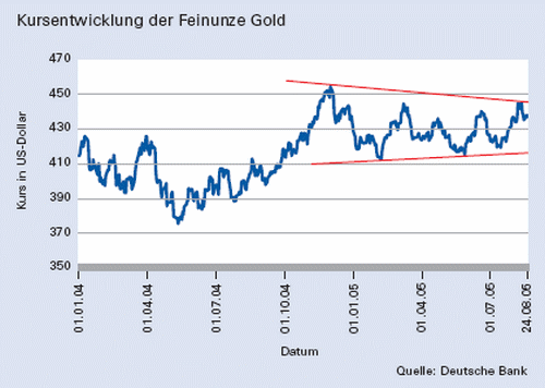 Das Edelmetall befindet sich nach seiner breit angelegten Bodenbildung in den Jahren 1998 bis 2002 in einem langfristigen Aufwärtstrend, der es von knapp über 250 US-Dollar auf 457 US-Dollar beförderte. Seit Ende 2004 konsolidiert Gold derzeit den vorausgegangenen Kursanstieg im Rahmen einer sich verengenden Spanne, die formationstechnisch als symmetrisches Dreieck gedeutet werden kann. Die Begrenzungslinien des Dreiecks verlaufen derzeit bei ca. 449 bzw. 415 US-Dollar. Ein Durchbruch einer der beiden Marken könnte den weiteren mittel- bis langfristigen Kursverlauf bestimmen.
