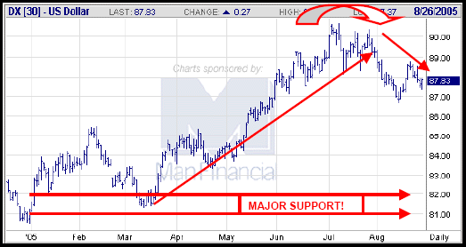 Finally, the dollar should fall and gold should rally, due to the poor immediate response of the U.S. government to this building human tragedy. The U.S. Dollar Index should fall to 84.40 and Gold should initially rise to 453.17. A rise in bonds, commodities, and gold is an Intermarket anomaly, but that combination is the likely outcome during the current crisis.