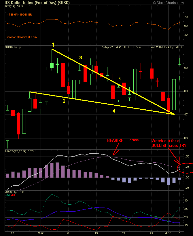 da der Dollar bereits imstande ist aus dem kleinen Dreieck nach oben zu thrusten. Doch bei aller Liebe zu 3ecken und Thrusts nach oben (und dies sieht in der Tat nach einem "sauberen" Breakout+Thrust aus!) habe ich so Zweifel derzeit beim aktuellen Thrust des USD.