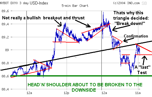 da der Dollar bereits imstande ist aus dem kleinen Dreieck nach oben zu thrusten. Doch bei aller Liebe zu 3ecken und Thrusts nach oben (und dies sieht in der Tat nach einem "sauberen" Breakout+Thrust aus!) habe ich so Zweifel derzeit beim aktuellen Thrust des USD.
