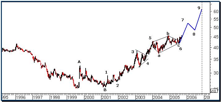 But the most significant change in the last day has been one of perception. When the gold price returned towards its peak, most observers were suspicious and cautious. No-one wanted to set the pace. The consolidation was treated as a 'peaking', but the buyers, physical and funds kept nibbling at those positions that were triggered by activated stops. This carried on until yesterday, when all resistance dropped away and the sprint from $450 to $460 began. Now the performance in the € is far more spectacular than in the $ as you can see by looking back at the last issue, at the London Fix in the € which was €356 in the morning. Now we are at €376. Any doubts about de-coupling should have been dispelled by tis move. Gold is on its way, s we hope you went long at $456 or thereabouts as per our recommendation last week. It is looking at $480 as it brings $500 into its sights, before consolidating again. Having accepted the $450 area as its support the market opens the opportunity for long positions, but always with protective stops at support.The next expected dampener on the gold price comes on the 26th of September, which marks the beginning of the next Centtral Bank Gold Agreement year. Whilst the programme will begin then Sweden's paltry 10 tonnes is unlikely to darken the brightness of gold. But it must have become more and more apparent that a switch to an income producing currency is a poor investment and one that may have more politics than finance involved in the decision. Will they accelerate their sales and cap the price at these levels or will they spread their sales over the whole year? Again their pattern of selling will reveal their attitude to the gold price. And the big question is what will Germany do? Will they postpone thei option to sell for another year or will they sell now? Either way the market will pull in its horns around that day!