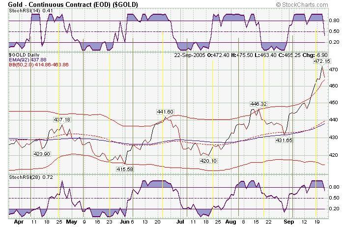 Behold the breakout for gold in the United States. The 470 level was penetrated on the December futures contract, but not quite on the spot market. My target from the chart is 495, with a flirt of 500 before the end of Jan2006. It could come as quickly as a thief in the night, and hit the 500 psychological objective before Christmas.