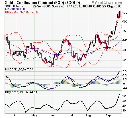 Behold the breakout for gold in the United States. The 470 level was penetrated on the December futures contract, but not quite on the spot market. My target from the chart is 495, with a flirt of 500 before the end of Jan2006. It could come as quickly as a thief in the night, and hit the 500 psychological objective before Christmas.