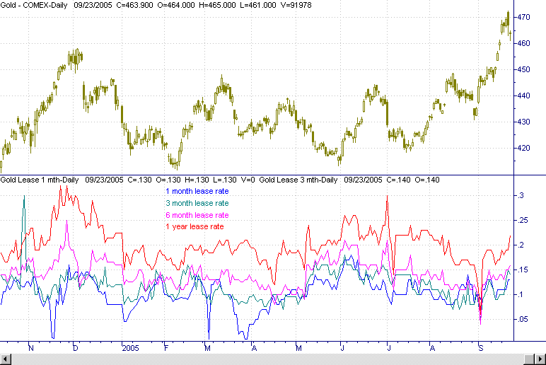 Naturally short-term rates are usually lower than longer-term rates, because a lessor can more confidently predict the immediate future than the remote future. Movement of all rates down together indicates a copious supply that players think more than sufficient to meet anticipated needs. Upward movement as a group indicates a clear and present shortage of physical gold with no relief in sight.