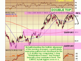 The 5-year chart for the dollar index shows the preceding bear market from early 2002 in its entirety and the substantial advance this year which broke the index out of the long-term downtrend. Although this advance has succeeded in swinging the moving averages into bullish alignment, it has clearly run into trouble at an important resistance level towards the top of the large trading range that ran from about March to October last year.