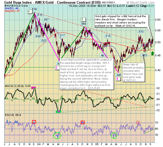 ..."On Wednesday (12/14/05), the gold stocks were in the midst of their 4th consecutive day down, USERX was falling below 9.86, and prices were going to close with a touch of the 16-20 index support. THAT WAS MY BUY SPOT AND I RE-ENTERED 100% LONG at 9.72...