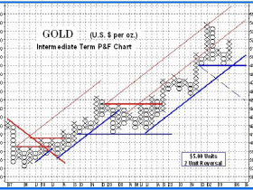 Auch ein Rückprall auf 520, 510 oder 500 muß noch immer kein Doppeltopp im klassischen Sinne bedeuten: es kann ganz einfach sein, daß der Goldpreis eine längere Zeit (ein paar Wochen bis zu mehreren Monaten, vielleicht sogar ein Jahr zwischen 540 und 490 Dollar konsolidiert. Ohne daß der Aufwärtstrend gefährdet ist.