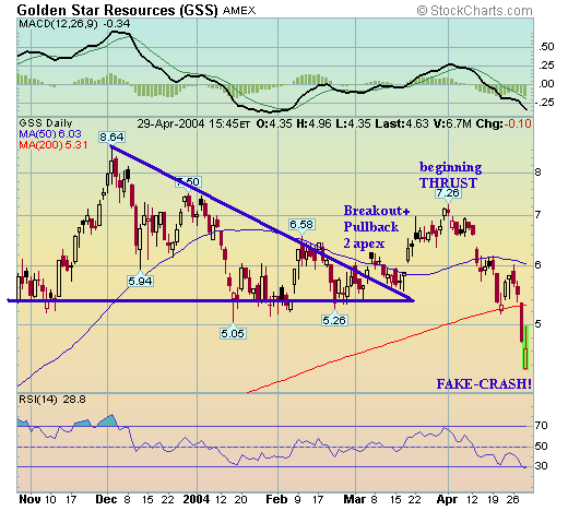 The XAU rose .86 to 82.06, while the HUI gained 2.10 to 178.79. Both closed well off their highs after coming out of the gait strongly. The notable exception was Golden Star Resources, which was battered falling to $4.44, down 29 cents. Most of the selling was due to Golden Star falling below $5, which means it is not marginable at many major Wall Street firms anymore. This is my number one holding and many Café members have picked it up along the way. One is the astute Eric Hommelberg who was kind enough to put out the following:
