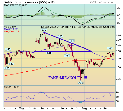 Like I said, panic selling, but does a break of the 200 dma automatically means the end of a bull-market ? Well, panicking investors do think so, I don’t ! Why not ? Well, because the fundamentals simply tell us otherwise (CA deficit, $ decline, negative interest rates, decreasing gold supply, increase of investor demand etc..). Again, take a look at the chart above. This is Golden Star crashing through it’s 200 dma ! End of Bull run? This was July 2002. Many investors threw in the towel because they didn’t believe in the Gold bull anymore. Yes, in July 2002 investors were so desperate that they sold Golden Star at 73 cents ! (see chart below)