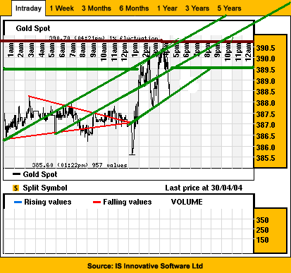 • Der Goldpreis hat nach meiner Beobachtung eine starke Beziehung zum Euro/Dollarkurs, da bei fallendem Euro sich das Gold für einen Käufer im Euroraum verteuert. Und der Euro ist in der letzten Stunde von 1,2010 auf 1,1970-1,1975 gefallen. M.E. ist darin der kleinere Goldpreisrückgang zu begründen.