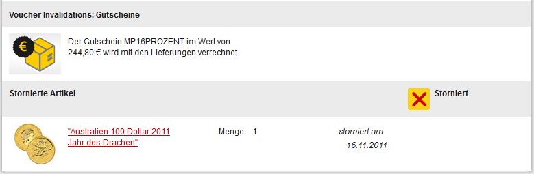 Erst Gehirn einschalten bzw. lesen, dann meckern. Es wurde häufiger auf individuelle Gutscheincodes hingewiesen. Das waren meistens nur 10€-Rabattcodes. Bei denen gibt es keinen Ausschluss von Münzen und Edelmetallen. Die allgemeingültigen Gutscheine (15% etc.) werden i.d.R. storniert, man kann aber auch mal Glück haben und eine Bestellung rutscht durch.