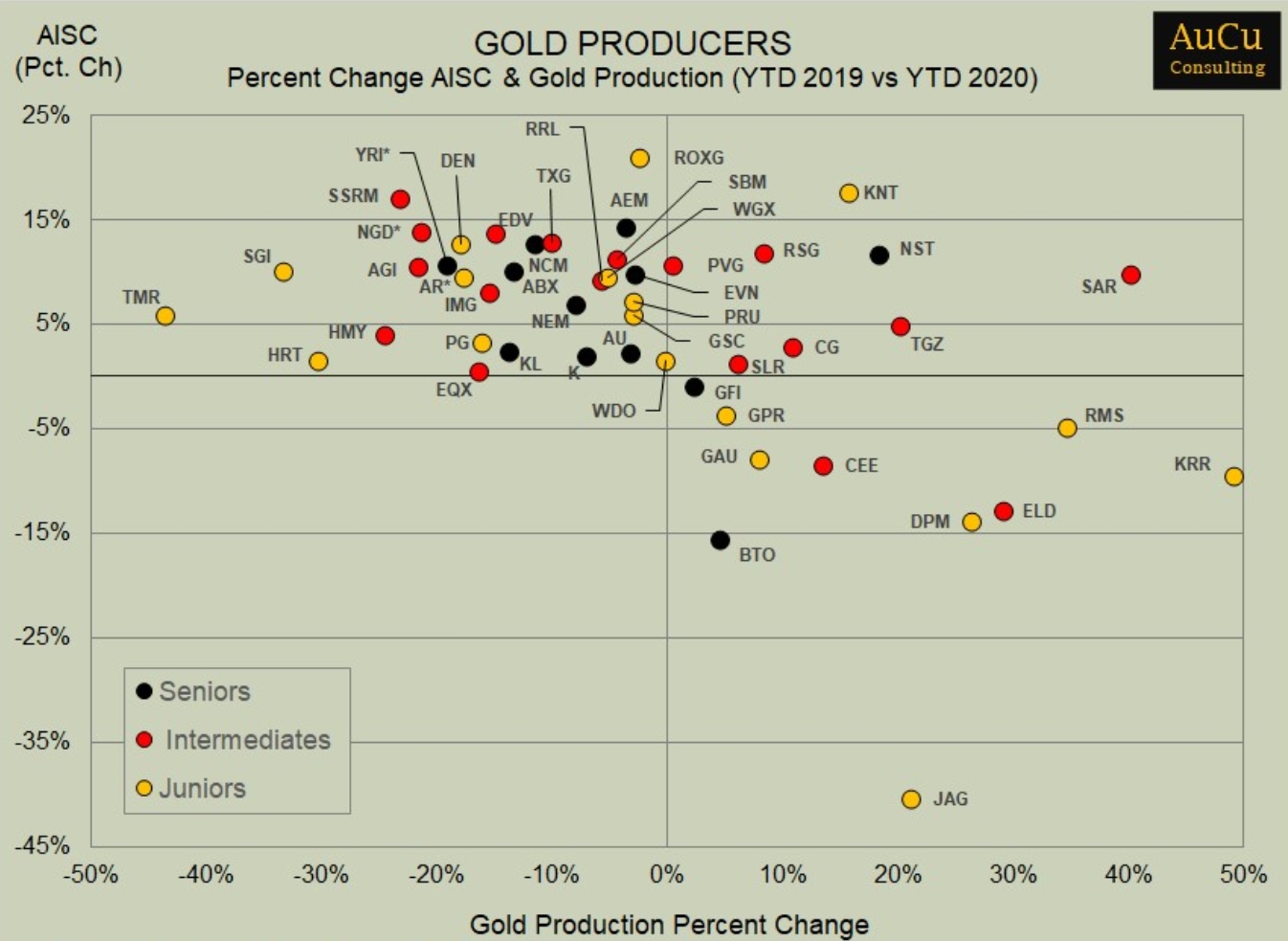Auffallend ist die schon beinahe verdächtig isolierte Position von JAG im optimalen rechten unteren Quadaranten; es scheint also seltener vorzukommen, als dass man gemeinhin annimmt, dass ein Produzent seine AISC deutlich senken und zugleich seine Produktion deutlich ausweiten kann. Immerhin korreliert eine solche Entwicklung (zumindest bei JAG) mit einem ebenfalls (für Produzenten) bemerkenswerten Kursverlauf:
