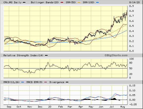 Auffallend ist die schon beinahe verdächtig isolierte Position von JAG im optimalen rechten unteren Quadaranten; es scheint also seltener vorzukommen, als dass man gemeinhin annimmt, dass ein Produzent seine AISC deutlich senken und zugleich seine Produktion deutlich ausweiten kann. Immerhin korreliert eine solche Entwicklung (zumindest bei JAG) mit einem ebenfalls (für Produzenten) bemerkenswerten Kursverlauf: