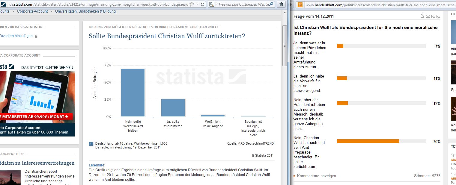 Denke es ist auch nicht zweckdienlich seitens der Presse diese 1.005 woauchimmerherkommenden Stimmen als gegebenen Rückhalt der Bevölkerung weiterzureichen, nicht wenn eigene Umfragen in den eigenen Blätter dieses Bild völlig um 180 Grad auf den Kopf stellen und das sogar mit zigtausenden Stimmen.