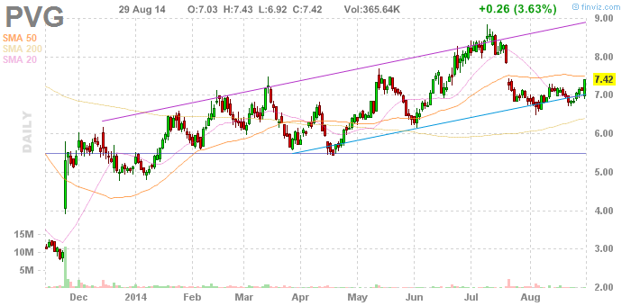 Zu PVG habe ich aktuell einen schönen Chart mit Kommentar in einem sehr guten Blog gefunden. Wie schon zuvor gezeigt, befindet sich PVG in einem Aufwärtstrendkanal, wo der Kurs nach nach Rücksetzern Unterstützung findet.