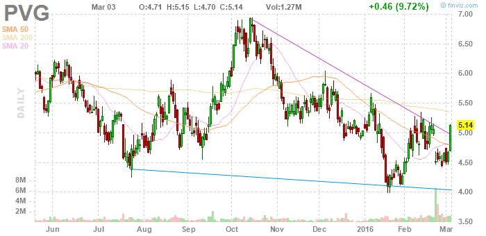 Habe hier soeben verdoppelt, zu 4,60 USD. Sehe den Zuwachs mehr als trading-Position, an sich hatte ich genug. Aber PVG zu diesem Preis!...
