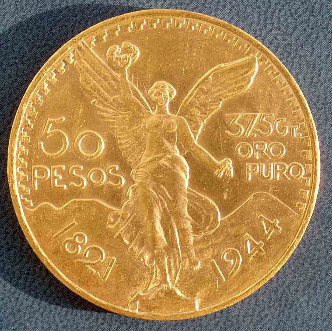 50 Pesos ,Mexiko,41,66 g,Feingehalt 37,5 g,der aktuelle Bankpreis liegt bei ca. 450 €.