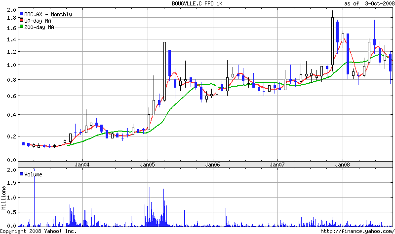 Charttechnisch stehen wir kurz vor dem Ausbruch aus einer 12 jährigen Seitwärtsbewegung.Das Doppeltop in 1994 wurde gebildet als das Pritzker Angebot von 3.35 USD/Share von Rio Tinto mit der Begründung abgelehnt wurde,man wolle seine *****Crownjuwels***** auf Bougainville schliesslich nicht verschleudern.Das war wohlgemerkt mitten im Bürgerkrieg und damals schwankte der Kupferpreis bei lediglich 1000-1400 USD.Dieser Preis hat sich seither mit 5-7 multipliziert,was auch mit dem BOC Kurs mittelfristig passieren wird Sehr schön kann man im BOC Chart den Impakt erkennen,welcher durch die Unterzeichnung des Friedensvertrages u.die Veröffentlichung der Studie von Swen Lorenz Ende 2004 ausgelöst wurde.Schon damals hat er als erster die Wiedereröffnung vorhergesagt.Es ist immer sehr lukrativ VOR dem Mainstream investiert zu sein.