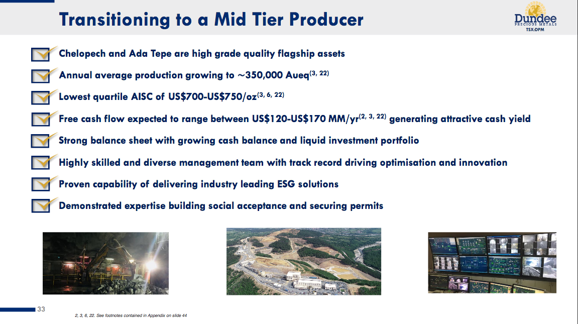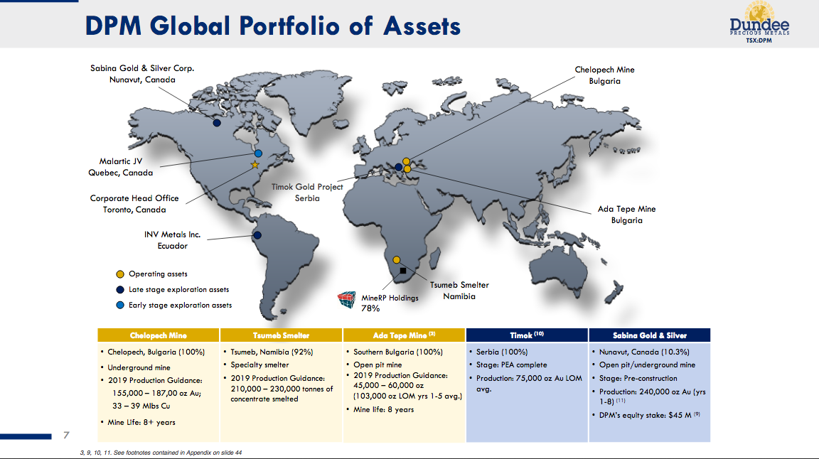 ZitatDundee Precious Metals Inc. is a well-financed, Canadian based, international gold mining company engaged in the acquisition, exploration, development, mining and processing of precious metals. The Company's principal operating assets include the Chelopech operation, which produces a gold, copper and silver concentrate, located east of Sofia, Bulgaria; the Kapan operation, which produces gold, copper, zinc and silver concentrate, located in southern Armenia; and the Tsumeb smelter, a concentrate processing facility located in Namibia. DPM also holds interests in a number of developing gold properties located in Bulgaria, Serbia, and northern Canada, including interests held through its 51.4% owned subsidiary, Avala Resources Ltd., its 47.3% interest in Dunav Resources Ltd. and its 11.5% interest in Sabina Gold & Silver Corp.