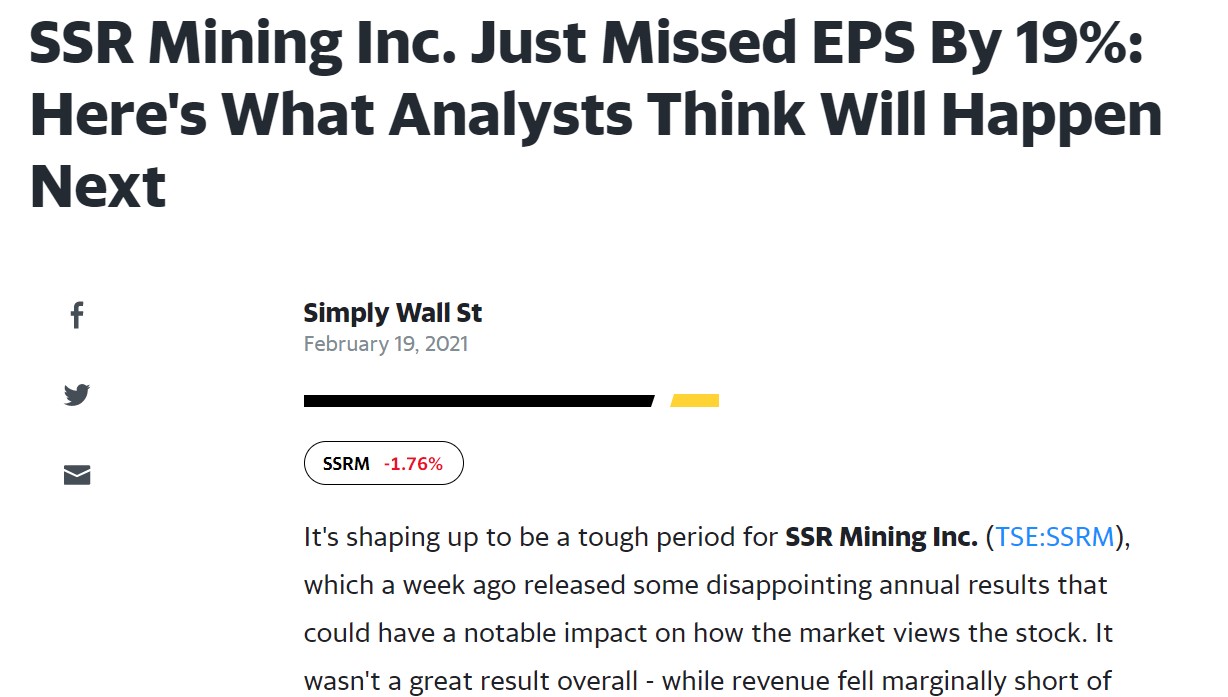 "Currently, the most bullish analyst values SSR Mining at CA$39.00 per share, while the most bearish prices it at CA$27.80. "