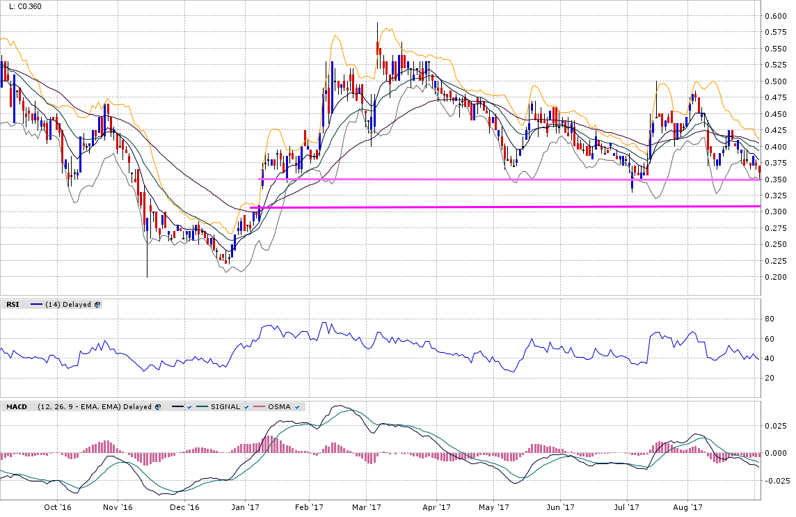 Chart: Am 10. August offenbar schlechte Drillresultate, was den Kurs durch alle MA's fallen liess. Am 22. August wurde der Versuch der Wende zum Guten wieder umgedreht. Seither ist es halt so, gut zu sehen, dass sich GQC auf der falschen Seite der MA's befindet. Grundsätzlich sieht die Anordnung der MA's sehr bärisch aus. Allerdings kommt nun die Unterstützung bei rund 0.35. Demzufolge kämpfen nun die horizontale Unterstützung gegen den Trend gegeneinander. Anfang Juli beim gleichen Match ging die horizontale Unterstützung als Sieger vom Platz. Evt. will der Markt aber noch den Gapclose bei 0.31.
