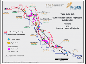 „Much of the database was generated during Goldquest's initial reconnaissance of the Tireo gold trend 10-plus years ago, the first systematic exploration of any kind in the region. Since then, the discovery and advancement of the Romero, Romero South and Candelones deposits have increased the understanding of the ore-forming processes, and improved techniques for identifying and testing new targets. Goldquest and Precipitate are now applying these refined techniques to their respective holdings in the belt. Goldquest is currently undertaking the first systematic mapping campaign ever carried out on its entire holdings while Precipitate plans to commence its next phase of fieldwork in the coming weeks, with results to follow...“.