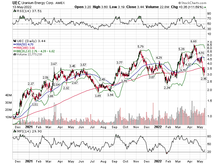 Der Boden wird sicherlich noch mal getestet. Uraninvestitionen betreffen einen sehr kleinen Markt der hochvolatil ist. Viele Unternehmen sind stark verschuldet und der globale Zinsanstieg erzeugt starke Schmerzen. Die meisten Uranaktien sind für mich Zockeraktien (außer z.B. Cameco - als guter Dividendenzahler). Ich fahre meine Positionen nach Anstiegen wie gestern bei UEC gerne auch wieder auf 0 zurück. Wir befinden uns in einem Bärenmarkt mit Rückgang der Industrieproduktion - und Stagflationstrends.