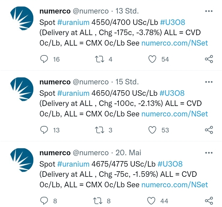 Spot #uranium 4950/5100 USc/Lb #U3O8 (Delivery at ALL , Unch) ALL = CVD 0c/Lb, ALL = CMX 0c/Lb See https://numerco.com/NSet