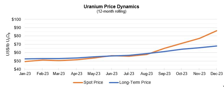 Einerseits weist Uran eine sehr unelastische Nachfragekurve auf, da die Versorgungsunternehmen meist für die Anreicherung zahlen und die Preise für Rohuran für die Brennstoffkosten unerheblich sind. Für die Endabnehmer von Uran ist vor allem eine beständige und verlässliche Versorgung wichtig, da die Preise für Rohuran im Vergleich zum Brennstoffpotenzial unerheblich sind.
