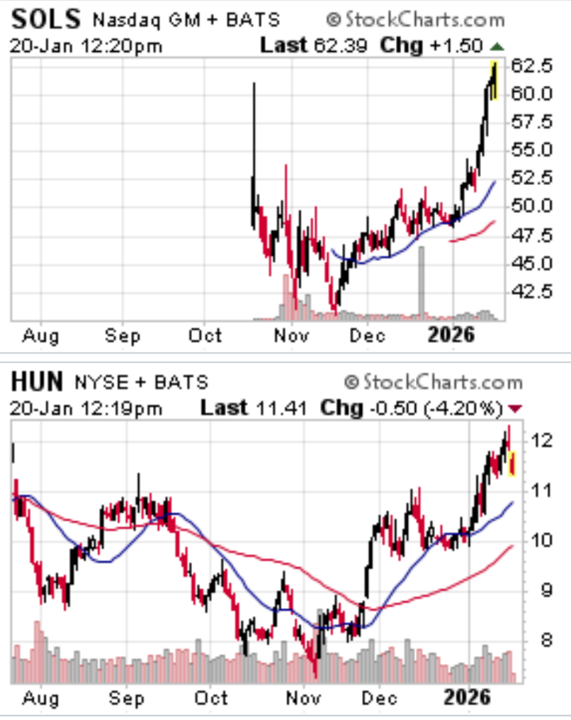 SOLS hat nach der Ausgliederung von Honeywell das mögliche zyklische Tief der Chemieaktien im November voll mitgenommen. Zuletzt schon im Anstieg stärker als der Rest. Und aktuell (s. oben) steigt sie weiter, während der Rest in eine Konsolidierung (zunächst auf Tagesbasis) einzusteigen scheint.