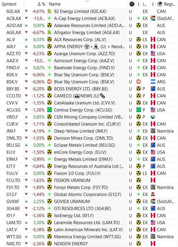 • Na wer ist denn noch in die Betreiber RWE, Vattenfall, EnBW oder in Siemens investiert? Ein interessanter Betreiber ist der Tscheche CEZ der auch auf das Lithiumvorkommen im Erzgebirge einen Blick geworfen hat (Bin investiert - korrigiert gerade). Centrus Energy in US ist auch super gelaufen (Bin investiert).