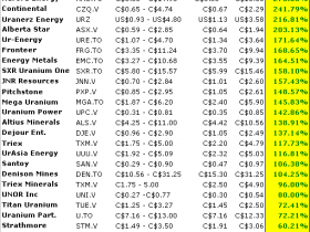 Ja, die Notierungen haben gewaltig angezogen, aber wenn ein Wert wie Energy Fuels (EFR.V) von 0,09 Cent aus startet und schon bald uranhaltiges Gestein liefern kann, während die anderen noch jahrelang mit ihren Rucksäcken durch die Gegend streifen werden, ist ein solcher Kursanstieg schon nachzuvollziehen, wenngleich für einen möglichen Neuinvestor abschreckend.