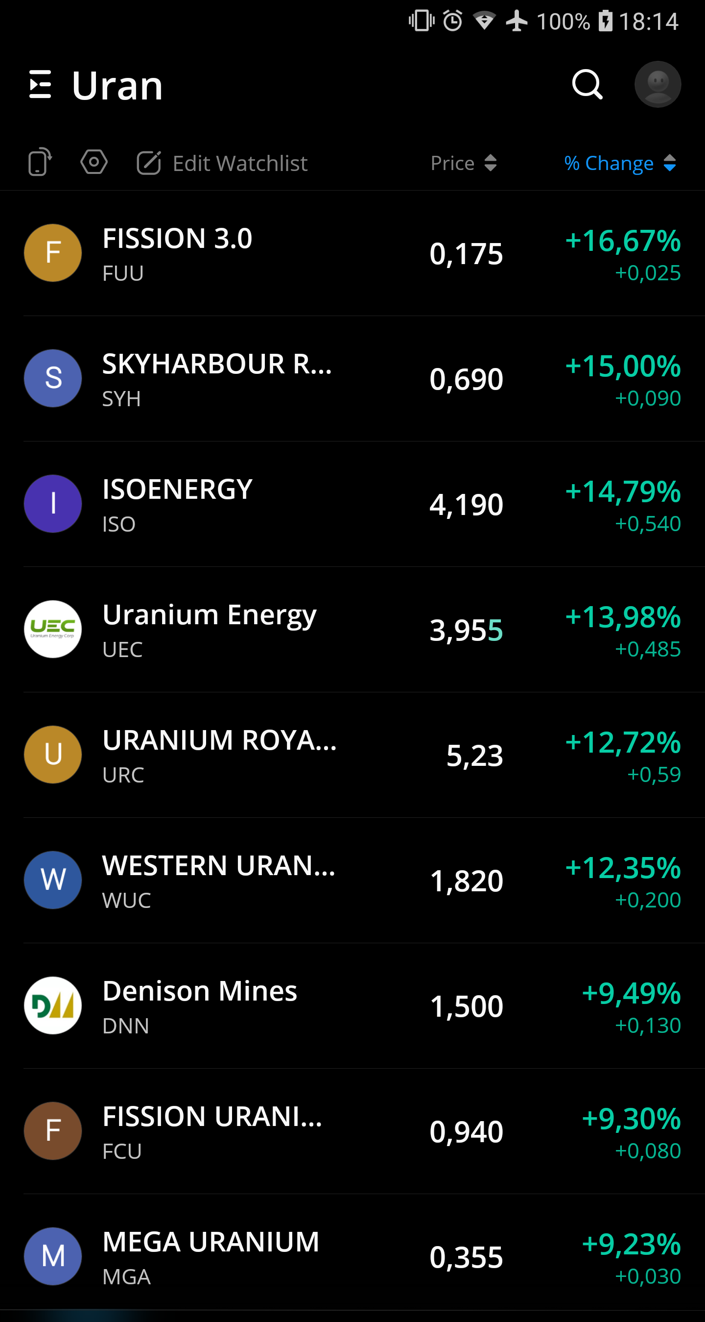 Bin gespannt, was sich morgen an den US-Börsen tut. Ein Uranium Energy habe ich eben zwischen 2,25 und 2,19 € zu Tradingzwecken aufgestockt. Dieser Anteil wird morgen aber wieder verkauft.