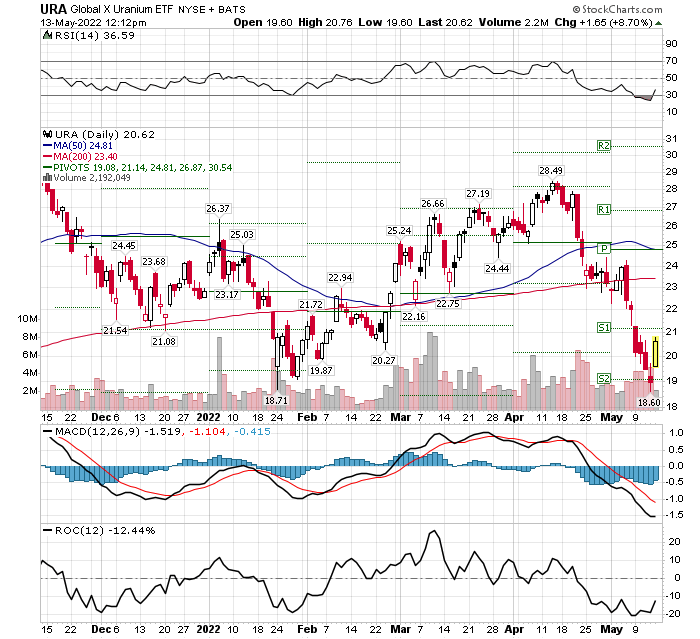 Der Boden wird sicherlich noch mal getestet. Uraninvestitionen betreffen einen sehr kleinen Markt der hochvolatil ist. Viele Unternehmen sind stark verschuldet und der globale Zinsanstieg erzeugt starke Schmerzen. Die meisten Uranaktien sind für mich Zockeraktien (außer z.B. Cameco - als guter Dividendenzahler). Ich fahre meine Positionen nach Anstiegen wie gestern bei UEC gerne auch wieder auf 0 zurück. Wir befinden uns in einem Bärenmarkt mit Rückgang der Industrieproduktion - und Stagflationstrends.