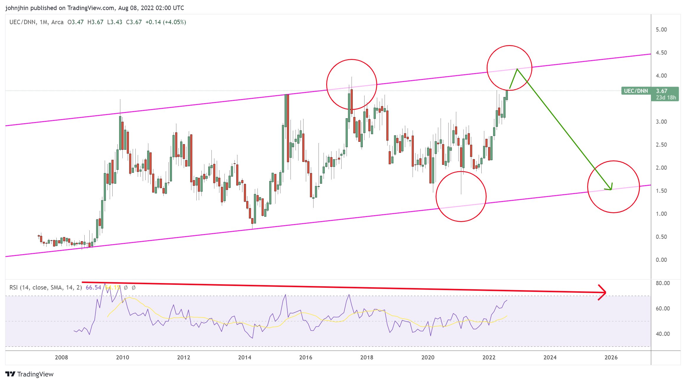 • Here is a ratio chart showing #uranium price (premium allowed) versus gold. We have a blue breakout plus backtest & once that blue backtest is done, it will most probably move up the right side of green rounded bottom/arc. Means uranium will outperform gold going forward.