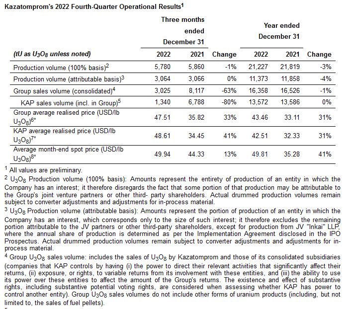 According to a company press-release, overall, uranium production in Kazakhstan (100% of KAP and its partners' production) was 21,227 tonnes in 2022, down 2.7% over 2021 (21,819 tonnes).