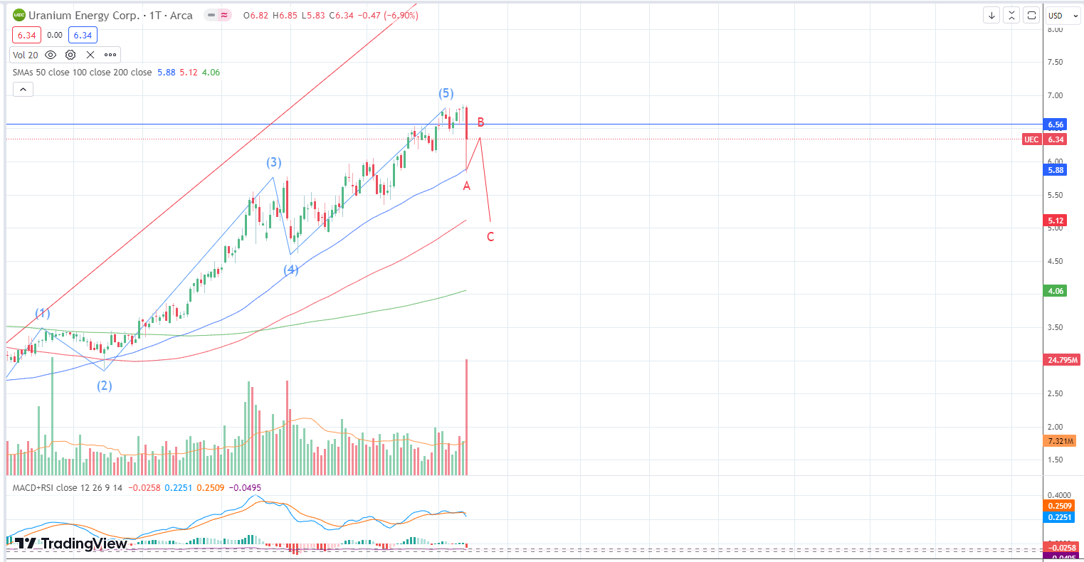 UEC entwickelt sich nach Plan. Der erste 5-Teiler sollte fertig sein. Ausgehend vom Zwischenhoch USD 6,80 könnte es jetzt zu einer Konsolidierung in Form einer Welle 2 kommen. Diese könnte uns in den Bereich USD 5,15 bringen (0,382) je nachdem wie stark sich die Indikatoren abkühlen müssen ggfls. auch eine Etage tiefer (USD 4,65 /0,5).