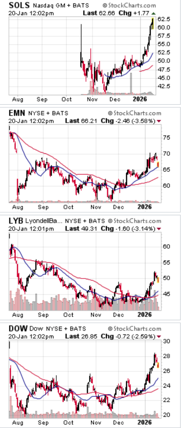 SOLS hat nach der Ausgliederung von Honeywell das mögliche zyklische Tief der Chemieaktien im November voll mitgenommen. Zuletzt schon im Anstieg stärker als der Rest. Und aktuell (s. oben) steigt sie weiter, während der Rest in eine Konsolidierung (zunächst auf Tagesbasis) einzusteigen scheint.