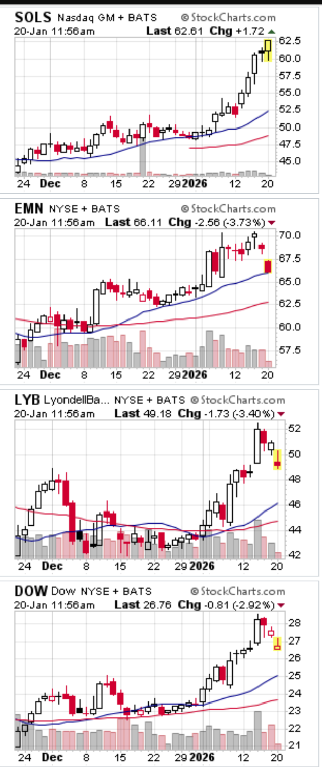SOLS hat nach der Ausgliederung von Honeywell das mögliche zyklische Tief der Chemieaktien im November voll mitgenommen. Zuletzt schon im Anstieg stärker als der Rest. Und aktuell (s. oben) steigt sie weiter, während der Rest in eine Konsolidierung (zunächst auf Tagesbasis) einzusteigen scheint.
