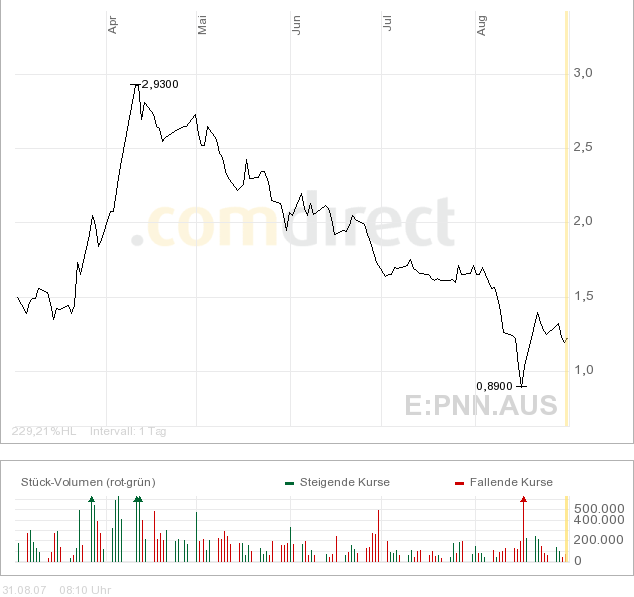 Hab mal meine alte Liste rausgekramt und bin direkt bei PepinNini Minerals (PNN) hängen geblieben. Es ging in kürzester Zeit von 2,93 AUS$ auf 0,89 AUS$. Zur Zeit 1,22.