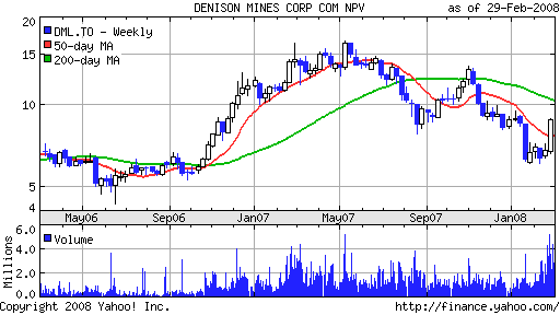 Denison (DML.TO) besitzt derzeit 4 produzierende Minen entlang ihrer Verarbeitungsanlage, der White Mesa Mill in Nevada, - neben anderen großen produzierenden Minen und Explorationsprojekten auf der ganzen Welt. Aktuell ist die Produktion in Nevada durch Genehmigungsverfahren für einen Ventilationsschacht eingeschränkt aber auch durch einen Mangel an qualifizierten Arbeitern (das scheint heutzutage ein generelles Problem zu sein). Drei neue Minen sollen voraussichtlich 2008 in Produktion gehen, womit Denison in Nevada über 8 produzierende Minen verfügen wird. Ich vermute, dass es nach Ablauf von 5 Jahren zu Engpässen bei der Uranproduktion in Nevada kommen wird. Der folgende Artikel gab schon vor 3 Jahren Hinweise auf solche Entwicklungen: http://www.iht.com/articles/2005/12/30/news/gold.php. Was unsere Investitionsabsichten anbetrifft, so sollten wir in etwa 3 Jahren anfangen, Kasse zu machen......