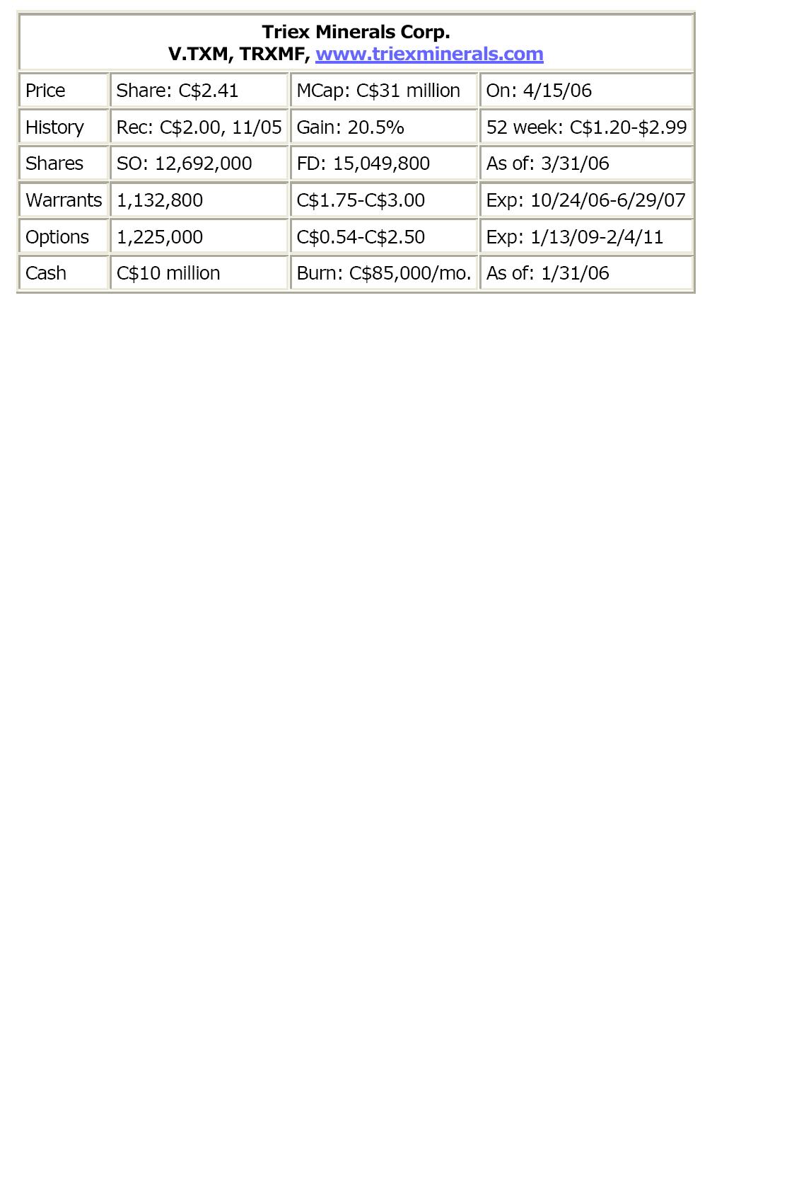 BUY—When we first wrote up Triex, we noted that it has excellent management, promising projects (including a number in prime areas of the Athabasca Basin) and an extremely low market cap. Those observations still hold.
