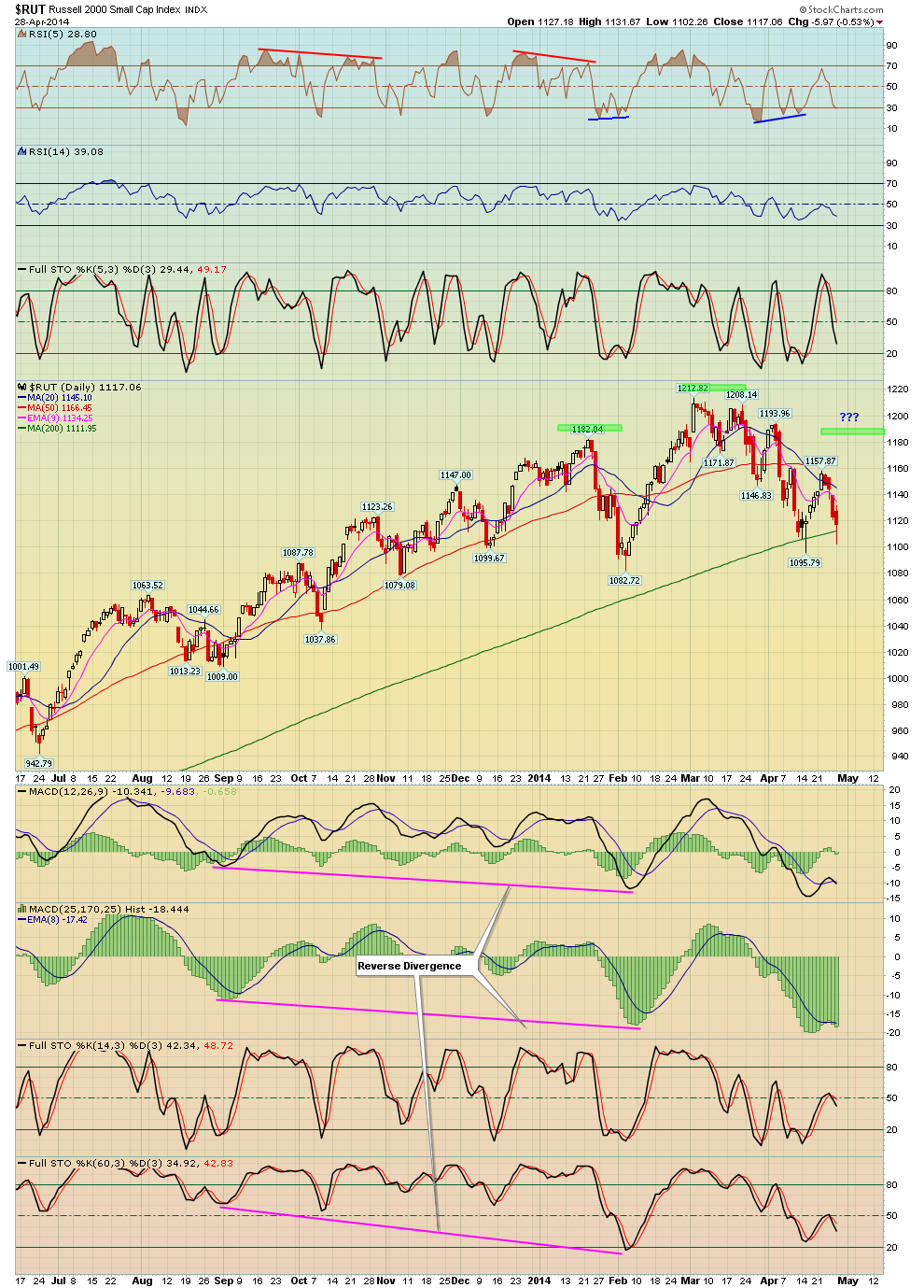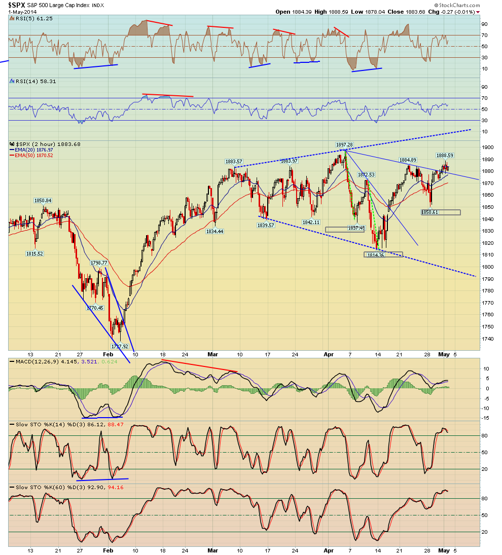 Aktien: Quälen sich höher. Viel News aktuell, aber das interessiert nur am Rande. Dass US-Wirtschaft im Winter um 1.1 % langsamer wuchs als erwartet wurde ganz schnell abgeschüttelt. Offenbar belebt sich das Geschäft nun im Frühling, weshalb Tapering in geordnetem Masse weitergeführt wird. Alles in allem bewirken die News nicht mal kurzfristig etwas. Aktuell befinden wir uns ungefähr kursmässig (US-Aktien) bei der ersten Möglichkeit, nach unten zu drehen. Die zweite Möglichkeit, meines Erachtens die wahrscheinlichste, ist rund 2 % höher. Siehe Chart S&P 500 Future, der weit besser performt aktuell als Nasdaq oder Russell.
